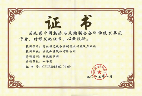 2015年度中國物流與采購聯(lián)合會科學技術獎評審會于9月24日在北京召開。由11位專家組成的評審小組在網(wǎng)評的基礎上進行了1天的集中會審,并提交評審委員會審議。最終評出本年度科學技術一等獎23項,二等獎51項,三等獎71項。我公司上報的“高位揀選設備關鍵技術的研發(fā)與產(chǎn)業(yè)化項目”最終榮獲一等獎。2015年度中國物流與采購聯(lián)合會科學技術獎評審會于9月24日在北京召開。