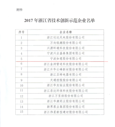12月8日,浙江省經(jīng)濟(jì)和信息化委員會(huì)和浙江省財(cái)政廳根據(jù)《浙江省技術(shù)創(chuàng)新示范企業(yè)認(rèn)定培育實(shí)施方案(2016-2018年)》等文件要求,經(jīng)各地推薦、審查、公示等環(huán)節(jié),省經(jīng)信委和省財(cái)政廳一致認(rèn)定,如意公司獲評(píng)2017年“浙江省技術(shù)創(chuàng)新示范企業(yè)”。寧波市僅兩家企業(yè)上榜。