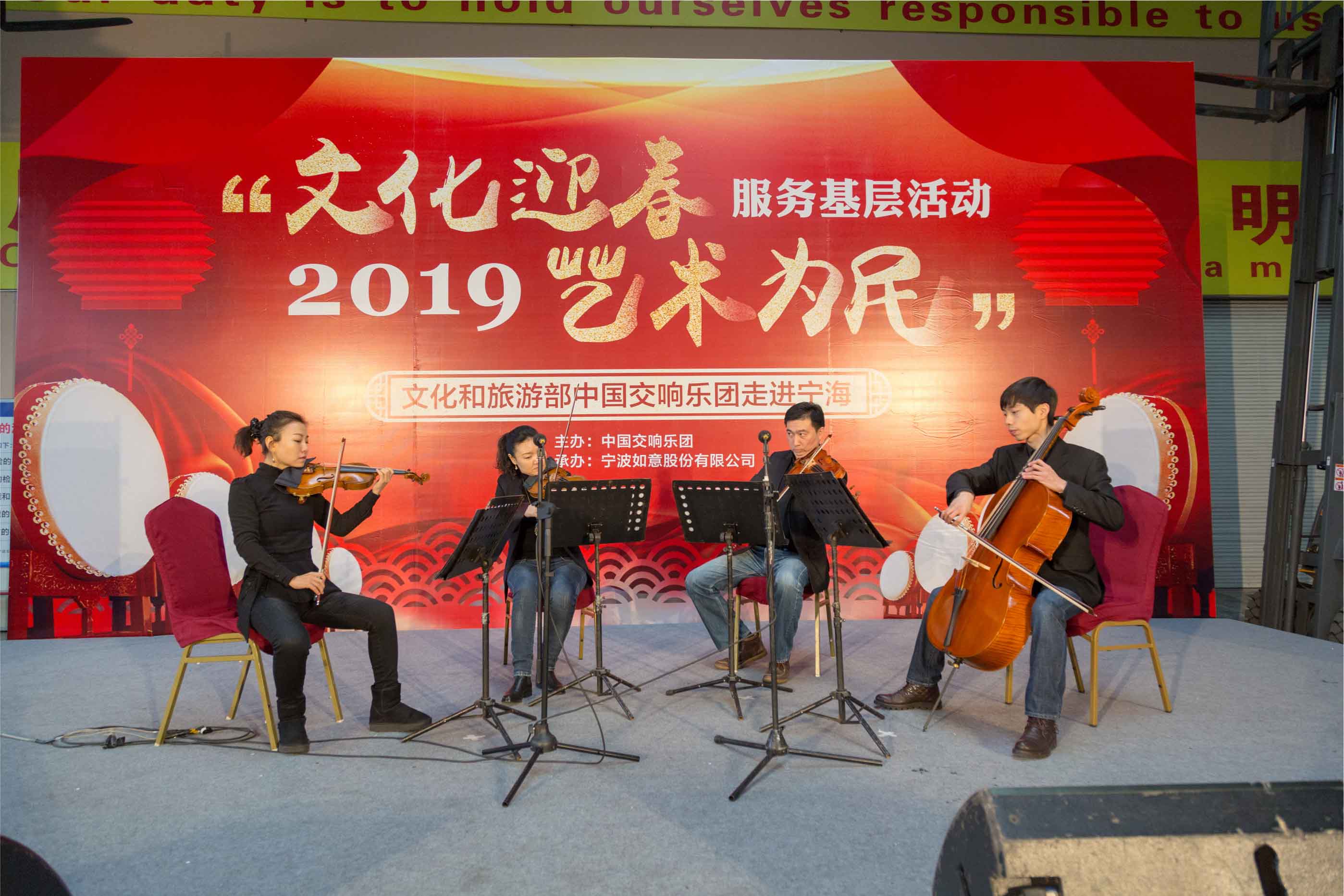 2018年12月30日上午,文化和旅游部中國交響樂團(tuán)2019“文化迎春、藝術(shù)為民”服務(wù)基層活動走進(jìn)寧波如意,演出在《共和國之戀》歌聲中拉開序幕。《我和我的祖國》《敖包相會》《我愛你塞北的雪》,以及著名的紫禁城弦樂四重奏《快樂的薩利哈》等精彩節(jié)目,讓廣大如意員工如醉如癡。此次演出是中國交響樂團(tuán)堅定文化自信,繁榮發(fā)展社會主義文藝,推動文化事業(yè)和文化產(chǎn)業(yè)發(fā)展的有效載體,是貫徹落實黨的十九大精神,讓藝術(shù)真正走進(jìn)人民、服務(wù)人民的具體實踐。