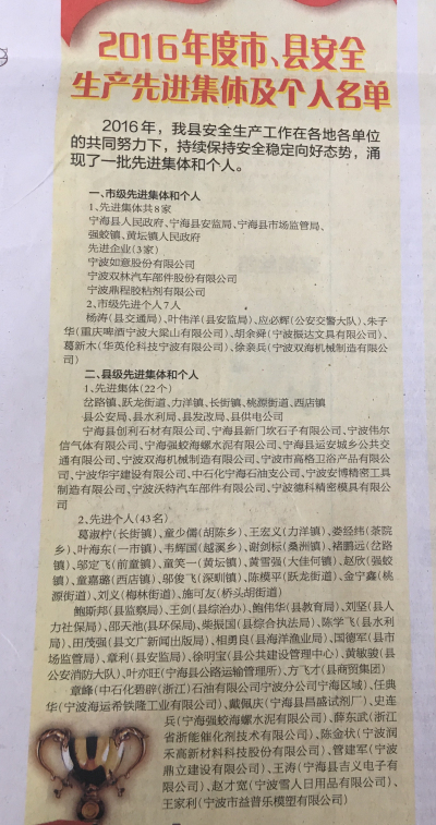 如意獲評“2016年度寧波市安全生產(chǎn)工作先進集體”