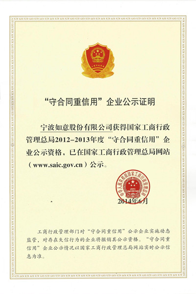 近日,如意公司獲得了國(guó)家工商行政管理總局授予的“全國(guó)AAA級(jí)守合同重信用企業(yè)”稱號(hào),這是公司繼2003年以來(lái)第三次榮獲該稱號(hào)。