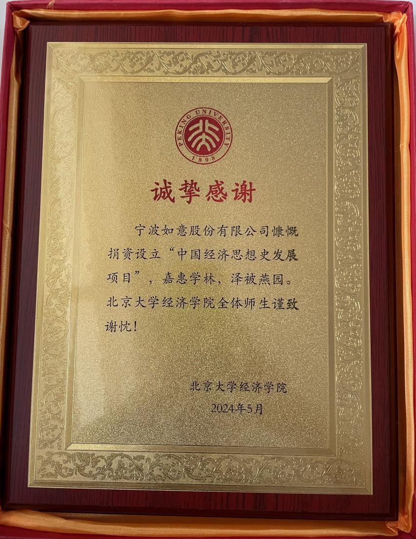 5月22日,寧波如意再向北京大學捐款24萬元,此次捐資旨在支持北大經(jīng)濟史學教育事業(yè)發(fā)展,更好的促進其人才培養(yǎng)和教學科研工作