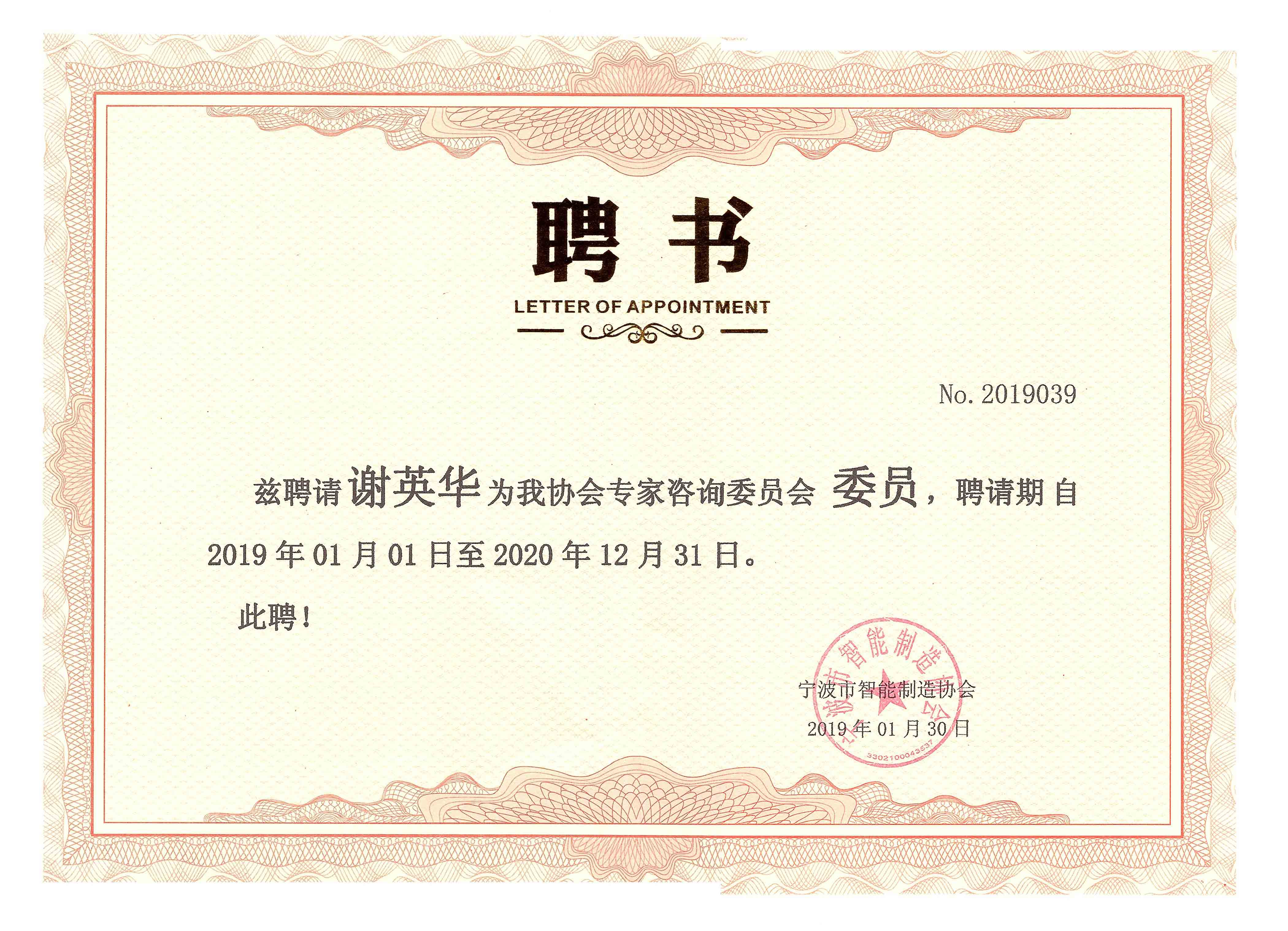 謝英華被聘為市智能制造專家委員會委員
